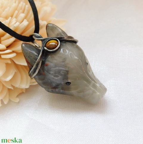 A medál tiffany technikával készült heliotróp tigrisszem, réz és ólommentes, ezüsttartalmú ón felhasználásával. A díszítés szintén saját készítésű, nem tartalmaz gyári elemeket.A fémrészt óezüstre patináztam és lelakkoztam, hogy sokáig szép maradjon.