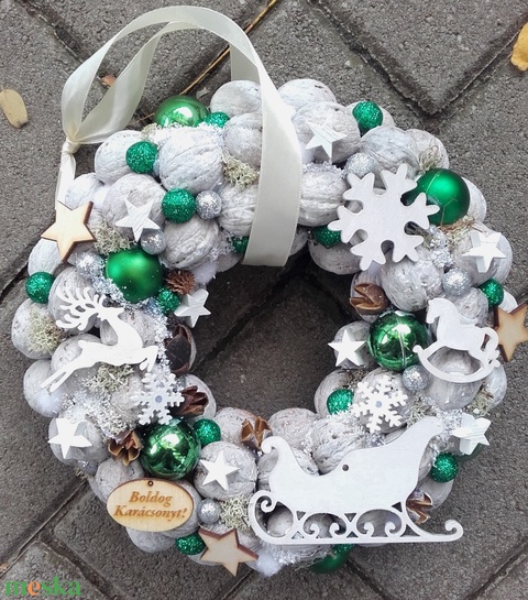ADVENT IDEJÉN ezüst-zöld-fehér- karácsonyi dekoráció, karácsonyi kopogtató, ajtódísz, koszorú