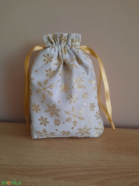Natúr alapon aranyszínű, csillogó, hópehely mintás vászon ajándékzsák
