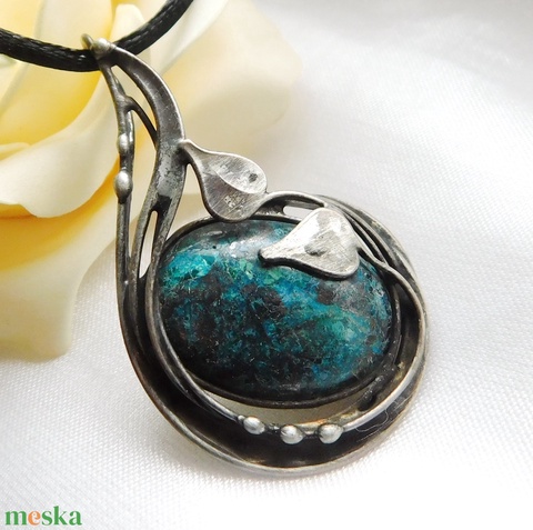 A medál Tiffany technikával készült krizokolla kabochon, réz és ólommentes, ezüsttartalmú ón felhasználásával. A díszítés szintén saját készítésű, nem tartalmaz gyári elemeket. A fémrészt óezüstre patináztam és lelakkoztam, hogy sokáig szép maradjon.