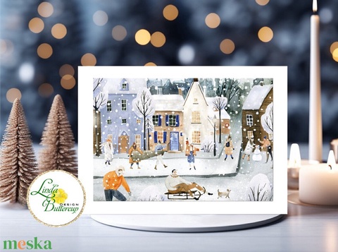 Téli táj, minimál stílusú rajz, havas, város részlet, Karácsonyi Képeslap, kinyithatós képeslap A6 méret borítékkal