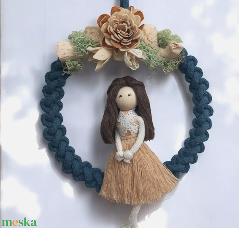 Petrolkék makramé falidísz bézs-barna makramé babával, natúr terméssel, zuzmóval