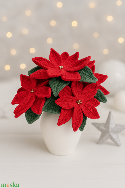 Horgolt Mikulásvirág csokor – kézműves karácsonyi dekoráció, örök virág dísz, ajándék, horgolt karácsonyi virág szett (5