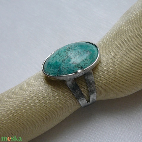 A gyűrű Tiffany technikával készült zöld türkiz és ólommentes, ezüsttartalmú ón felhasználásával. A díszítés szintén saját készítésű, nem tartalmaz gyári elemeket. A fémrészt óezüstre patináztam és lelakoztam, hogy sokáig szép maradjon.