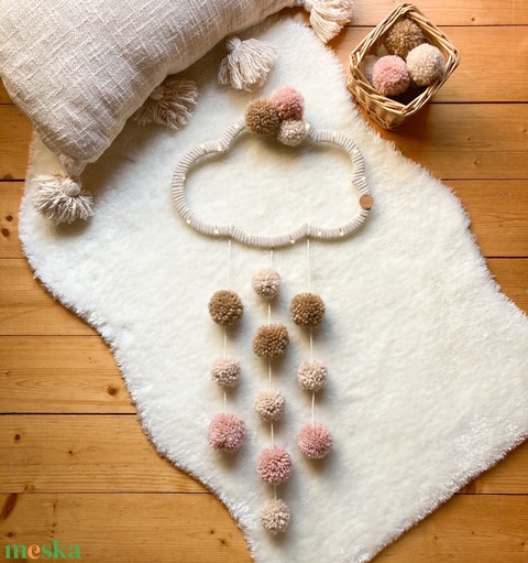Ez a gyapjú pompomokkal díszített, 100%-ban természetes alapanyagokból készült dekoráció a babaszoba, gyerekszoba falán nagyon édesen mutat.