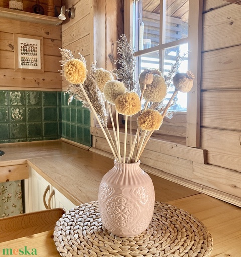 Ez a gyapjú pompomokkal díszített, 100%-ban természetes alapanyagokból készült virágcsokor tökéletes kiegészítője lehet az otthoni dekorációidnak. Nem hervad el, dekoratív, időtálló, környezetbarát