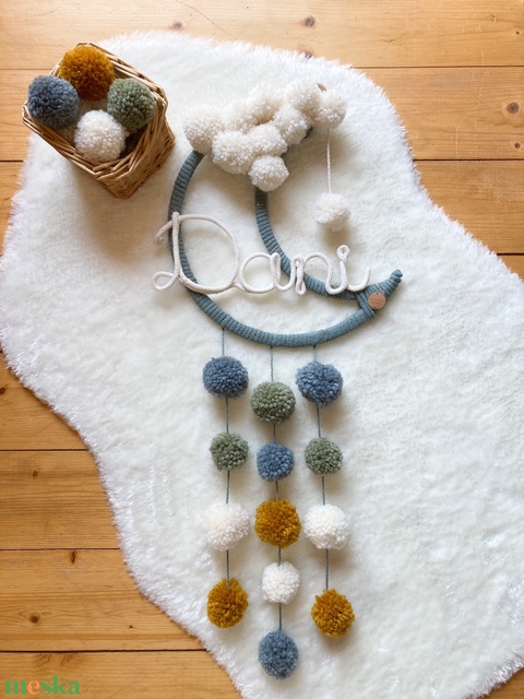 Ez a gyapjú pompomokkal díszített, 100%-ban természetes alapanyagokból készült dekoráció a babaszoba, gyerekszoba falán nagyon édesen mutat.