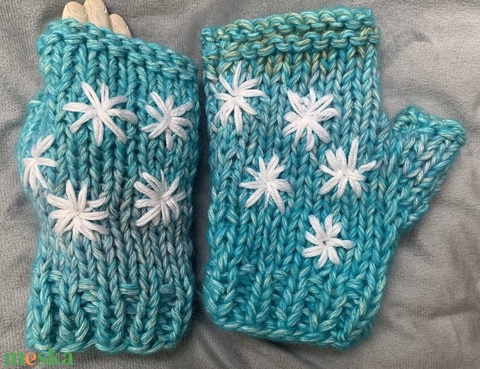 Kézi kötésű ujjatlan kesztyű világos kék melírozott gyapjú fonalból kézzel kötött, fehér virágokkal hímezve eladó