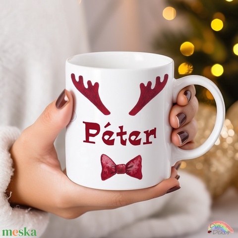 Névre szóló karácsonyi bögre szarvasaganccsal és csokornyakkendővel.