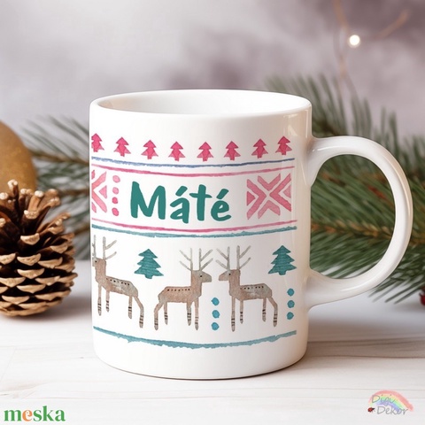 Névre szóló karácsonyi bögre szarvasokkal, fenyőfákkal, skandináv mintával. Egyedi ajándék férfiaknak.