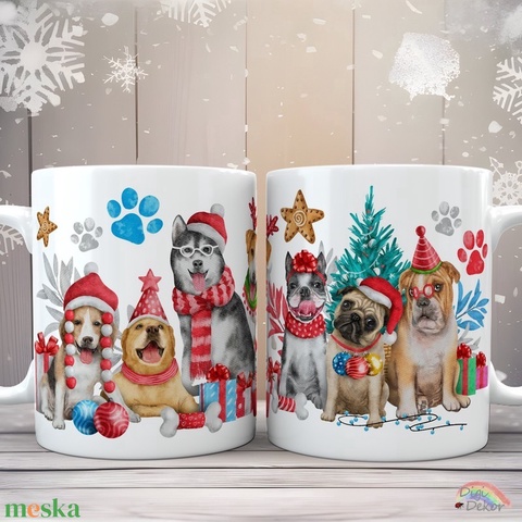 Jópofa, kutyás bögre karácsonyra. Kutyusok mikulássapkában, vidám jelmezekben. Aranyos karácsonyi bögre kutyásoknak