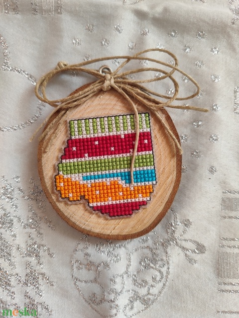 - Anyaga: hímzőfonal, plasztik, faszelet, kenderzsinór