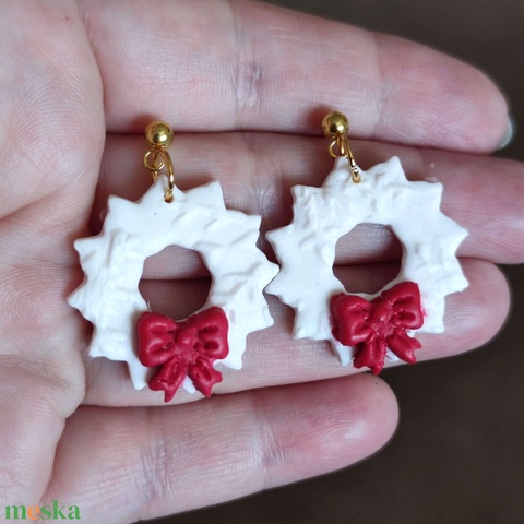 Fehér, dombormintás koszsorú piros masnival- fülbevaló