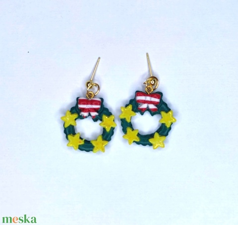 Zöld koszorú alakú fülbevaló csillagokkal és csíkos masnival díszítve