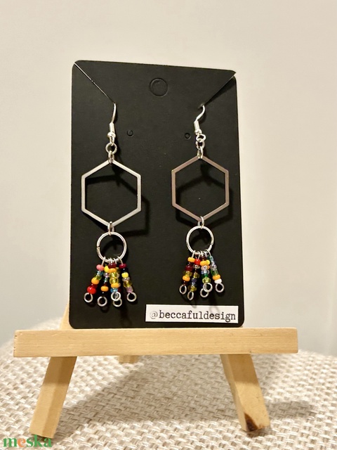 Színes hosszú lógós ezüst színű hatszög fülbevaló