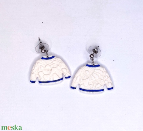 Fehér dombornyomott pulóver kék díszítéssel- fülbevaló