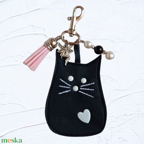 Kulcstartó, táskadísz fekete cicás - tekla gyönggyel II.