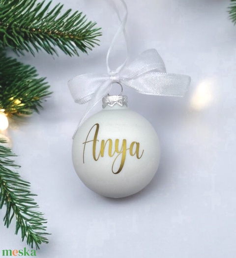 Karácsonyi üveggömb, egyedi, névre szóló felirattal - matt fehér, arany felirattal