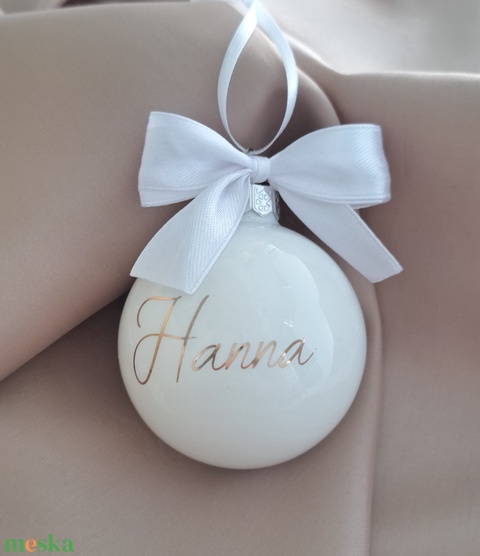 Karácsonyi üveggömb, egyedi, névre szóló felirattal - fényes fehér, rosegold felirattal