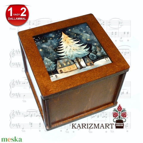 ★ Ugyanezt a terméket más mintákkal itt találod: https://www.meska.hu/shop/karizmart?s=58512 ★ További termékeinket pedig itt találod: https://www.meska.hu/shop/karizmart Apróságok, kincsek tárolására. A doboz hátoldalán található nyomógomb megnyomásával elindítható vagy leállítható a zene lejátszása. 2 dallamos lejátszás esetén a nyomógomb újbóli megnyomásával a következő dallam lejátszása indul el. A zenelejátszás kikapcsolható. ~~~Doboz~~~ - anyaga: pácolt és lakkozott fa - színe: barna - mérete: 9,5 x 9,5 x 7,5 cm - tárolóhely mérete: 8 x 6,5 x 6 cm ~~~Kép~~~ - anyaga: fém, felszínére rásütött festéknyomattal - mérete: 6,5 x 6,5 cm ~~~Kiegészítő a tető alsó részébe~~~ Belső kis tábla 7 x 4 cm-es arany színű fémtábla, 2-3 sornyi egyedi felirattal. (üdvözlet, köszöntő, köszönetnyilvánítás, idézet, stb...) A megrendelés megjegyzésében várjuk az elhelyezendő feliratot. ~~~Működése~~~ A zenélő doboz akkumulátora a mellékelt MicroUSB-2 típusú kábel segítségével, cserélhető kábeles okostelefon töltővel, vagy számítógép USB portjába csatlakoztatva tölthető. ~~~♫ Választható dallamok ♫~~~ DKA-01 - Csendes éj DKA-02 - Hull a pelyhes fehér hó DKA-03 - Kiskarácsony nagykarácsony DKA-04 - Mennyből az angyal DKA-05 - Ó, gyönyörű szép titokzatos éj DKA-06 - Ó, szép fenyő DKA-07 - Pásztorok, pásztorok DKA-08 - Suttog a fenyves DKA-09 - Arthur Warrell - We wish you a merry christmas DKA-10 - Bobby Helms - Jingle Bell Rock DKA-11 - Franz Gruber - Silent Night DKA-12 - James Lord Pierpont - Jingle Bells DKA-13 - Leroy Anderson - Sleigh Ride DKA-14 - Mariah Carey - All I Want For Christmas Is You DKA-15 - Slade - Merry Xmas Everybody DKA-16 - Thomas Oliphant - Deck the Halls DKA-17 - Wham - Last Christmas DKA-18 - Handel - Joy to the world A dallamokat a megrendelést követően tudod meghallgatni az általam elküldött link segítségével. De ha már az ízelítőnek itt felsoroltakból tudod melyik tetszik, akkor a megrendelés során másold be számát és címét a megjegyzésbe. 1 dallammal pl.: DKA01-Csendes éj 2 dallammal pl.: DKA04-Mennyből az angyal , DKA18-Handel-Joy to the world