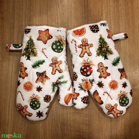 Fehér alapon mézeskalácsos, karácsonyos edényfogó kesztyű