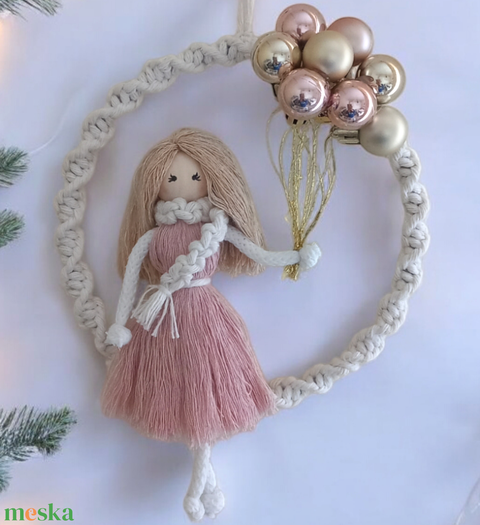 Téli makramé ajtó- és falidísz – sálas baba arany díszekkel
