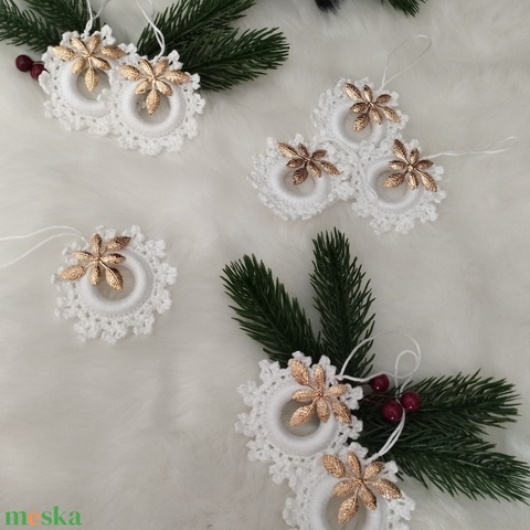 karácsony, karácsonyi lakásdekoráció, karácsonyfadíszek, fehér, arany, horgolt, karika, fém, akasztós, ajtódísz, koszorú, kopogtató, dísz, advent