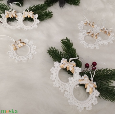 karácsony, karácsonyi lakásdekoráció, karácsonyfadíszek, fehér, arany, horgolt, karika, masni, akasztós, hópihe, ajtódísz, koszorú, kopogtató, dísz, advent, fém
