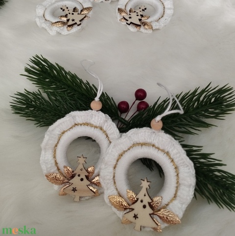 karácsony, karácsonyi lakásdekoráció, karácsonyfadíszek, fehér, arany, horgolt, karika, karácsonyfa, fém, fa, akasztós, fagolyó, fodros, fodor, ajtódísz, koszorú, kopogtató, dísz, advent