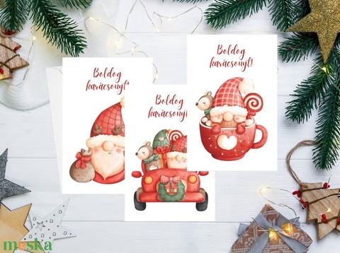 Karácsonyi képeslap csomag 3 db üdvözlőlap ajándék borítékkal manó gnome