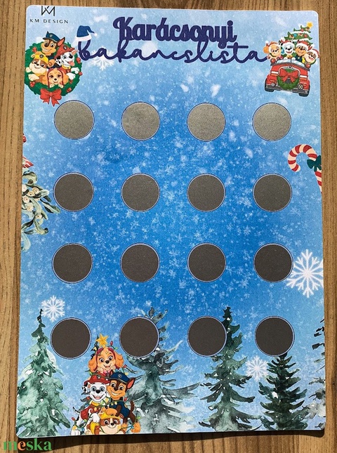 Összesen 12 db kaparós felület található rajta amik alatt 1-1 oyan dolog található ami kihagyhatatlan a karácsonyi hangulat eléréséhez, mint pl.: Mézeskalácsot készíteni.