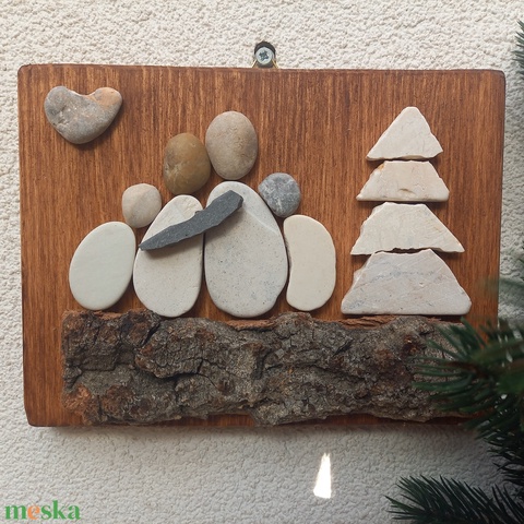 fa, lazúr, kavicsok, ragasztó, akasztó, fakéreg