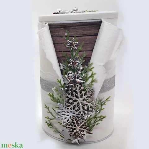 - Anyaga: fémdoboz, műanyag tetö, fa és műanyag díszek, merített papír, csipkeszalag, papírszalag