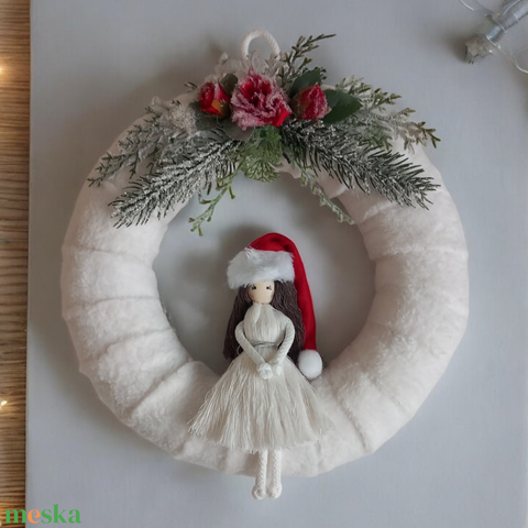 Letisztult téli kopogtató mikulás sapkás makramé babával