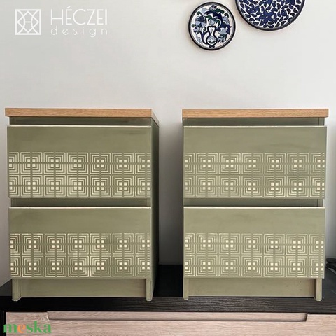 Gyönyörű egyedi festéssel újult meg ez a két fehérre pácolt tölgy furnér éjjeliszekrény. A bútorra Annie Sloan krétafestékei közül a Chateau grey árnyalat került. A tetejét és a fiókjait meghagytam eredeti állapotukban, a fiókokra stencilezett geometrikus mintát készítettem. A felület waxot kapott zárásként, ami bársonyos hatást ad a bútoroknak. Minden munka kézzel készült, ez az egy pár készült belőle.
