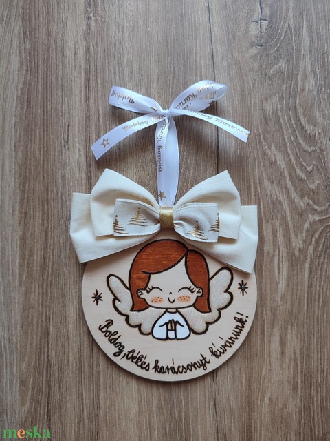 Karácsonyfadísz, angyalkás, tört fehér színű masnival