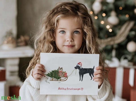 Kutyás, macskás karácsonyi képeslap, ünnepi üdvözlőlap, ajándékkísérő