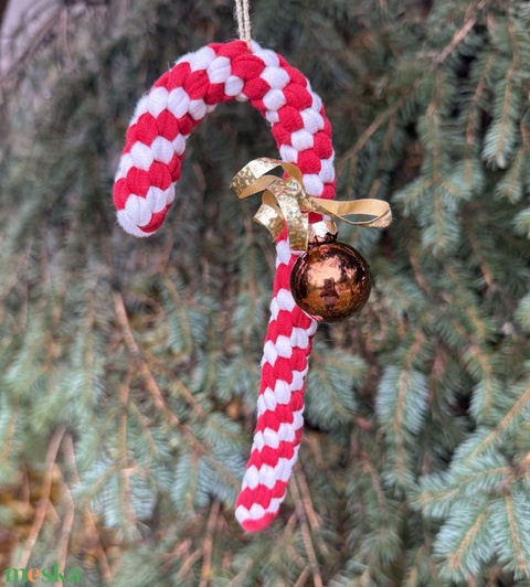 Makramé cukorpálca karácsonyfadísz – kézzel készült, természetes stílusban