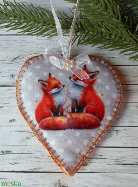 Szürke alapon róka mintás szív alakú karácsonyfadísz