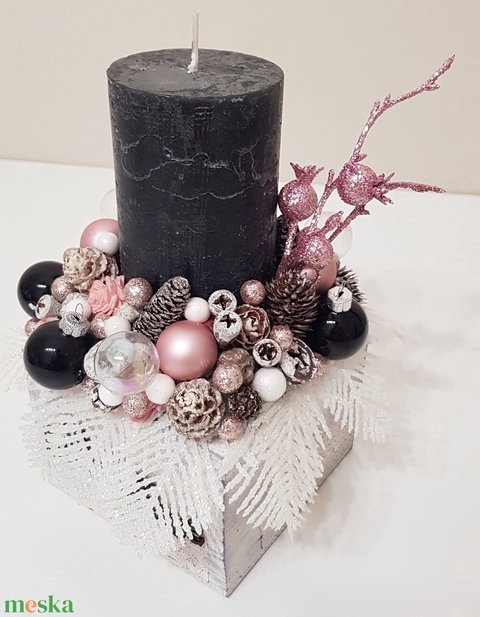 Rózsaszín-fekete karácsonyi asztaldísz gyertyával