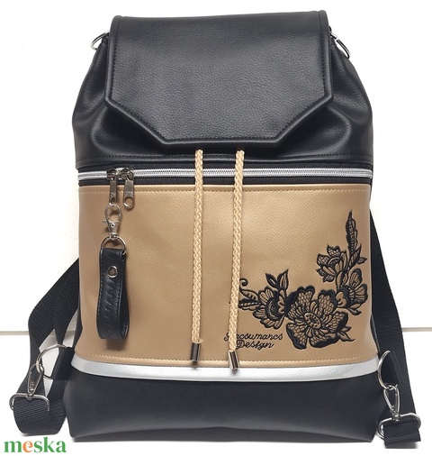 Fedélrészes zsinóros 3in1 hátizsák univerzális táska - Hímzett FantasyFlower007 fekete-óarany