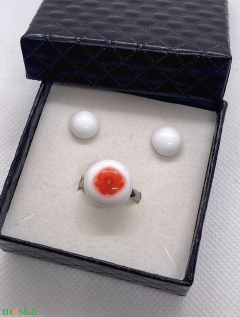 AKCIÓS! Fehér virággal gyűrű fülbevaló szett díszdobozban