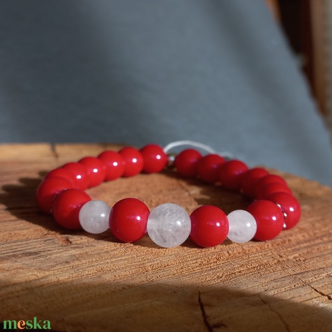 A vadítóan szexi korall piros jáde csodálatos kiegészítője lesz alkalmi öltözékednek. A gumis damilra fűzött karkötőhöz 8 mm-es gyöngyöket használtam, esetenként 6 mm-esekkel kombináltam, illetve különböző köztes gyöngyökkel tettem még izgalmasabbá.