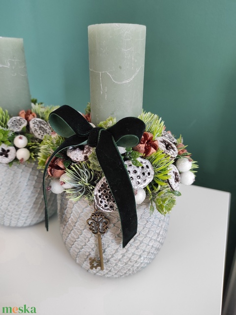 kaspó, tűzőhab, gyertya, műzöld, bogyó, termés, zuzmó, bársonymasni, kulcs