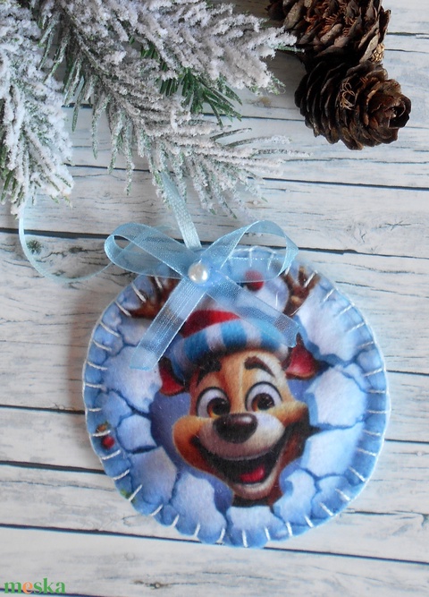 3D hatású 8 cm átmérőjű kör alakú karácsonyfa dísz (rénszarvas mikulás sapkában)