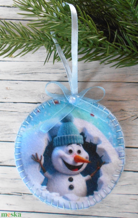 3D hatású kör alakú karácsonyfa dísz (vidám hóemberes kék sapiban)