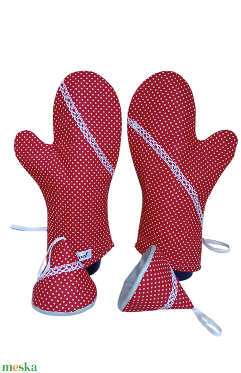 Piros, fehér, tűpöttyös. Edényfogó kesztyű 1pár, és egy pár fedőfogó, fülefogó ,