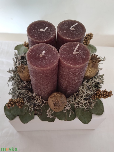 Adventi asztaldísz doboz zuzmóval, eukaliptusz levéllel, termésekkel - tartós karácsonyi asztaldísz - adventi koszorú