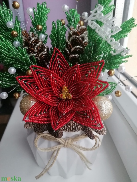 Mikulásvirágos karácsonyi asztali dísz gyöngyből