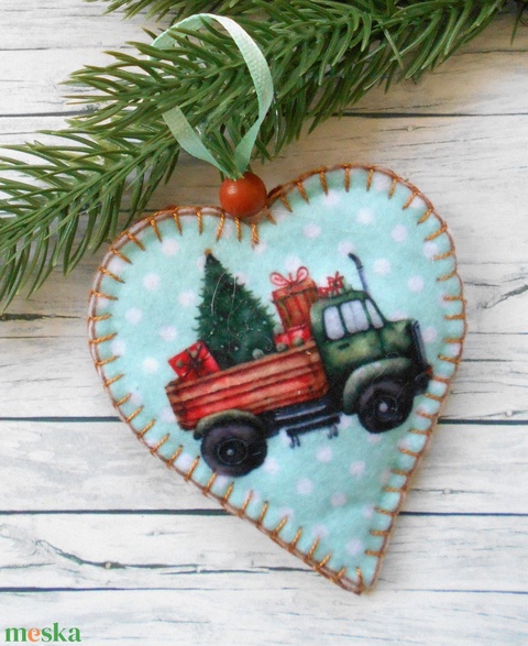 Retró stílusú szív alakú karácsonyfadísz zöld teherautó piros platós karácsonyfás